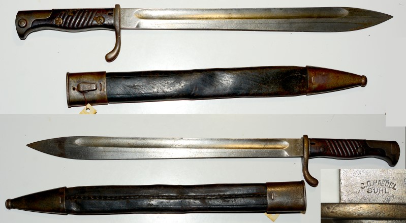 Deutsches Bajonett 98/05 2. Art jedoch mit Lederscheide, gestempelt "C.G. Haenel Suhl" und W15, Klinge leicht porig und rechte Holzgriffschale mit einem leichten Ausbruch, Scheide durch Lederschrumpfung 6-7mm zu kurz