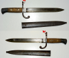 Österreichisches Bajonett M95, Klinge fleckig, Griffrahmen unten mit Bruch und Griffschalen stark abgenutzt, Koppelschuhhaken an Scheide fehlt