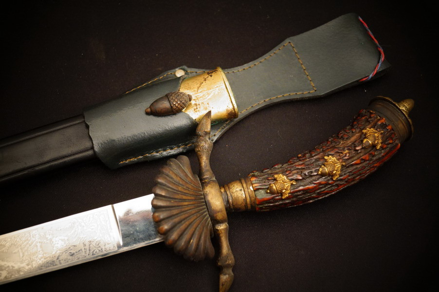 Zustand siehe Bilder. Original WK2. Bilder sind Gegenstand der Beschreibung. Sehr schöner Hirschfänger, geschmiedet. Lederscheide und Beschlagteile aus Bronze. Echter Hirschhorn Griff. Koppelschuh noch mit dran.
