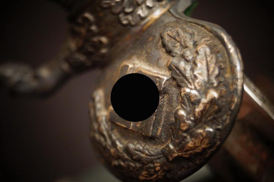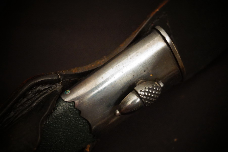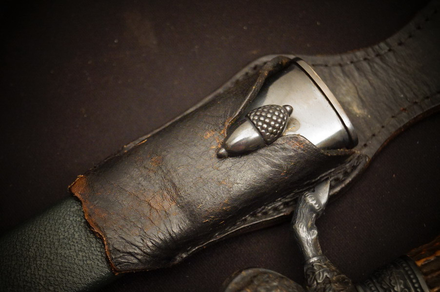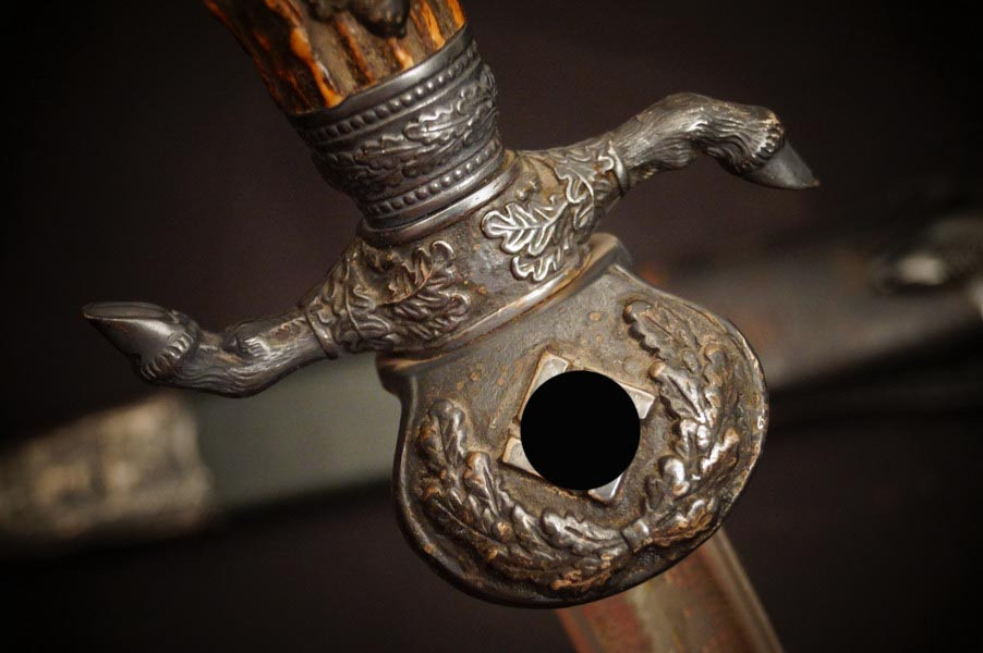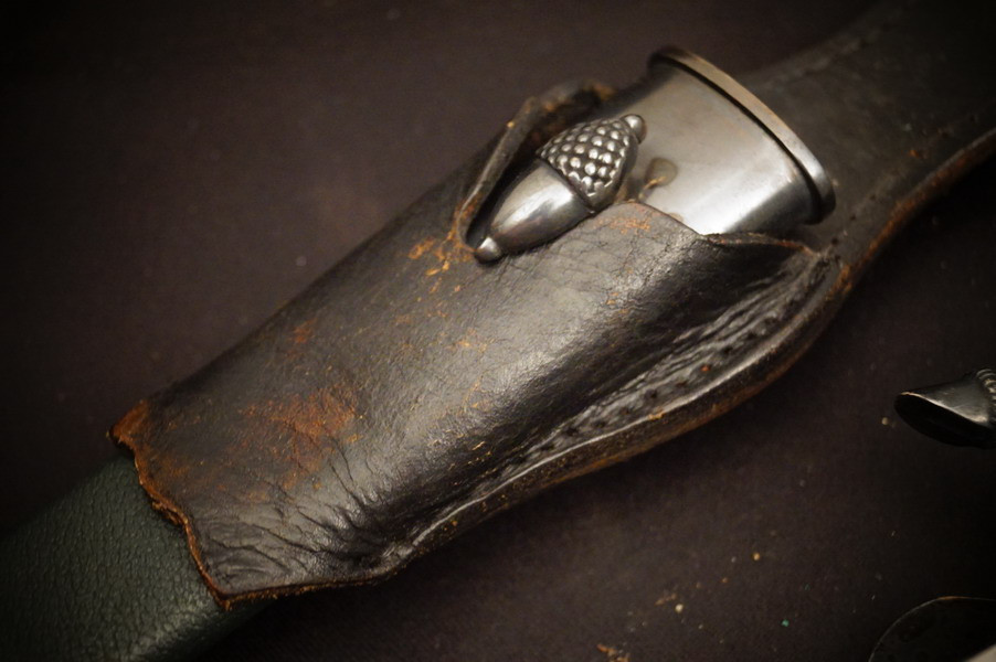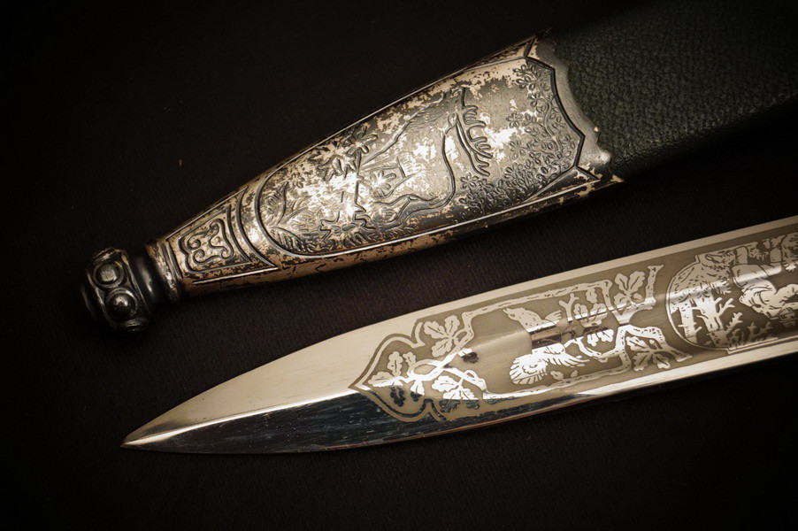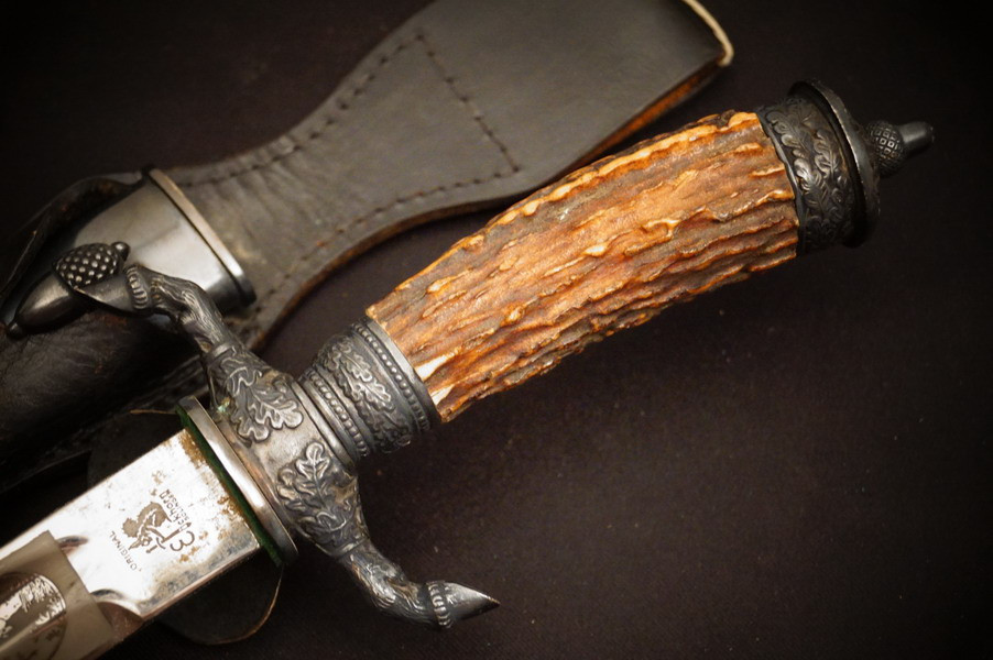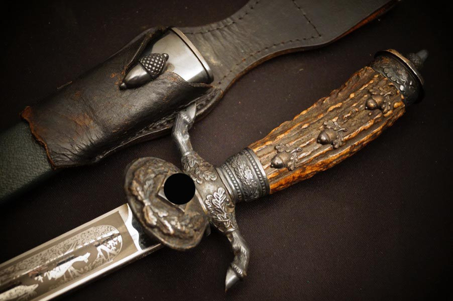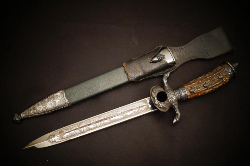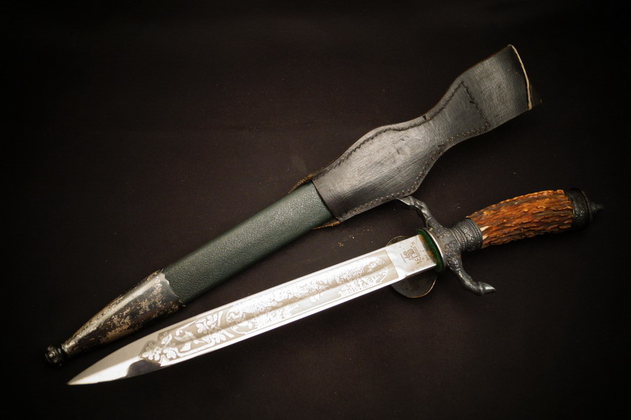 Zustand siehe Bilder. Original WK2. Bilder sind Gegenstand der Beschreibung. Lederscheide und versilberte Bronzebeschlagteile. Echter Hirschhorngriff. Sehr seltene Ausführung und mit massiver Klinge die beidseitig eine Hohlkehlung hat. Dreifache tiefe Ätzung, die Klinge und die Ätzung sind vernickelt.