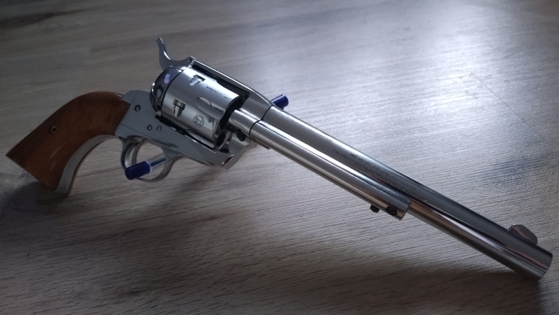 Sehr gepflegter SAA Texas Scout Peacemaker von H. Schmidt voll verchromt mit 7,5 Zoll Lauf. Frühe PTB Nr. 7-72. Kaliber 9mm Schreckschuss. Der Revolver ist zerlegbar und hat eine geringe Lauf-Verengung. Der Chrom ist ohne Beschädigungen, nicht wie bei einigen wo an der Trommel oder Rahmen durch starken Beschuss Schadstellen sind! Der SAA ist unverbastelt, alles noch im Original Zustand. Ein qualitativ schöner Revolver, Kenner wissen Bescheid. Sammlerzustand.