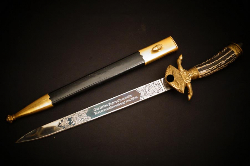Zustand siehe Bilder. Original WK2. Bilder sind Gegenstand der Beschreibung. Lederscheide und Stahlklinge mit dreifacher Ätzung. Gebläute Ätzung ! Deutsche Jägerschaft. Bronzebeschlagteile und alles mit sehr schöner Vergoldung. Hersteller sehr sauber in der Klinge.