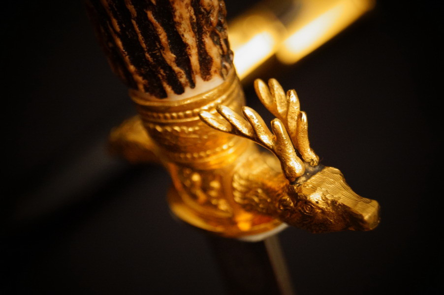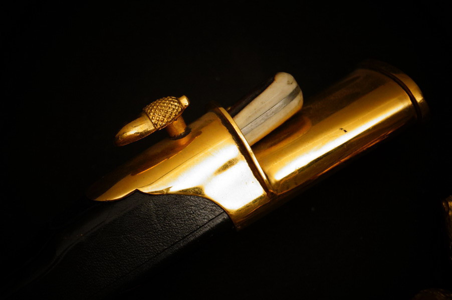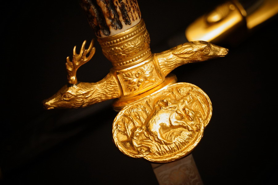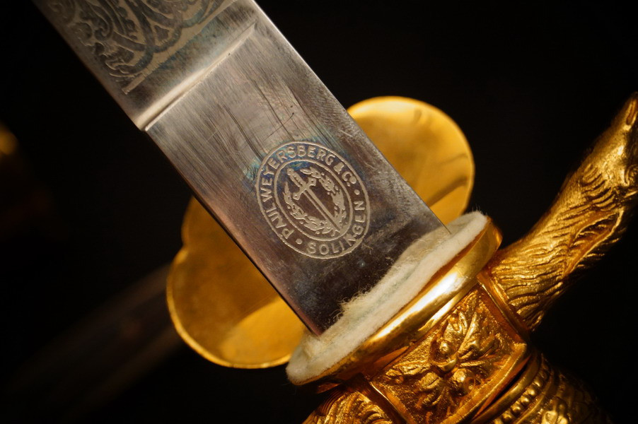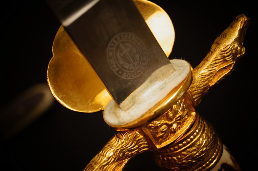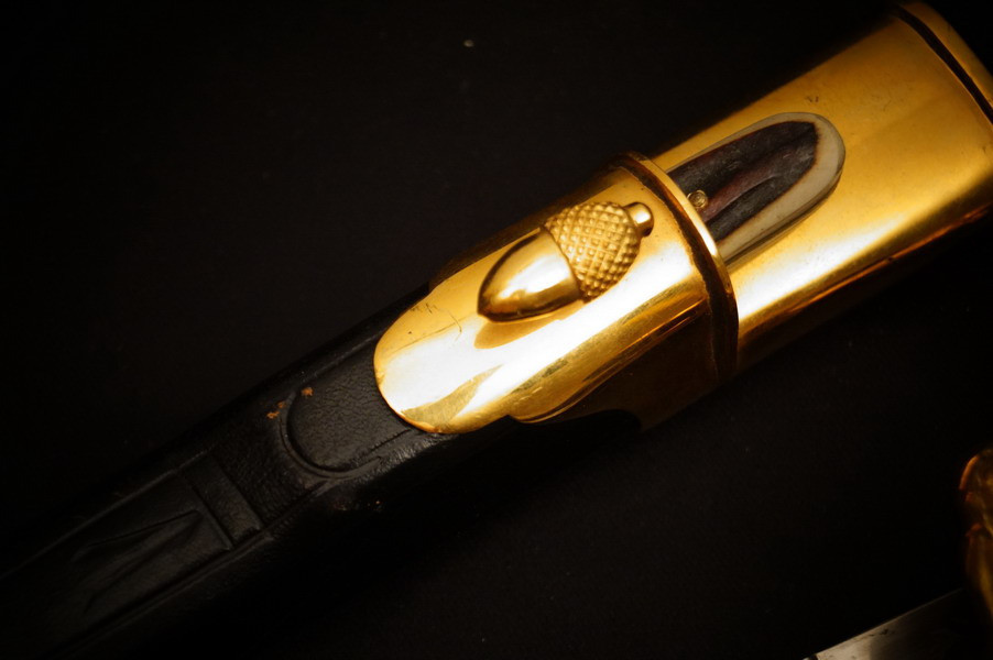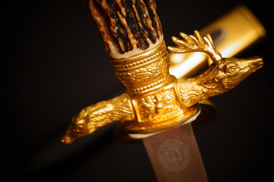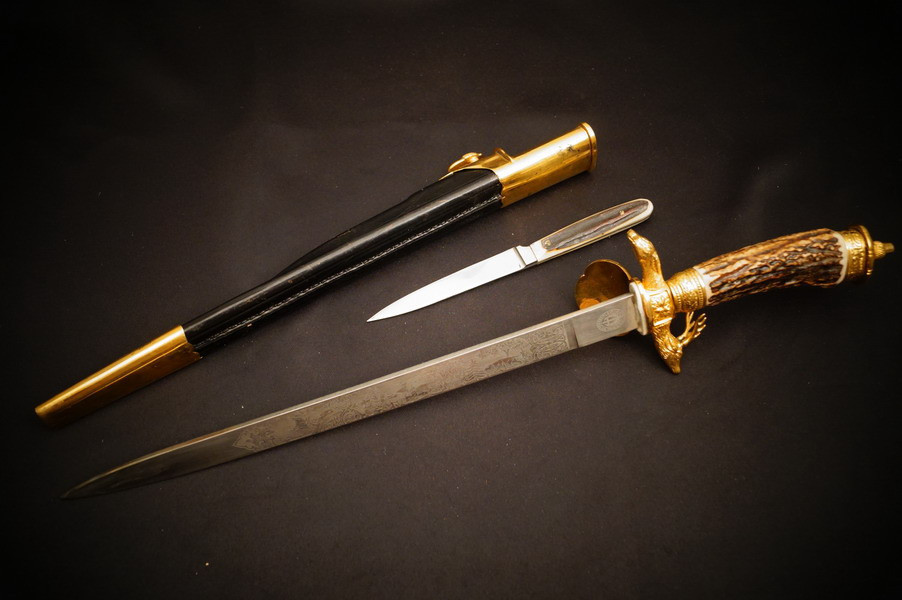 Zustand siehe Bilder. Original WK2. Bilder sind Gegenstand der Beschreibung. Lederscheide mit aufgesetzter zweiter Lederscheide für das kleine Messer. Stahlklingen, sehr feine Ätzungen. Alle Beschlagteile aus sehr gut vergoldeter Bronze. Echthorngriffe an den Blankwaffen. Sehr seltenes und sehr schönes Stück.