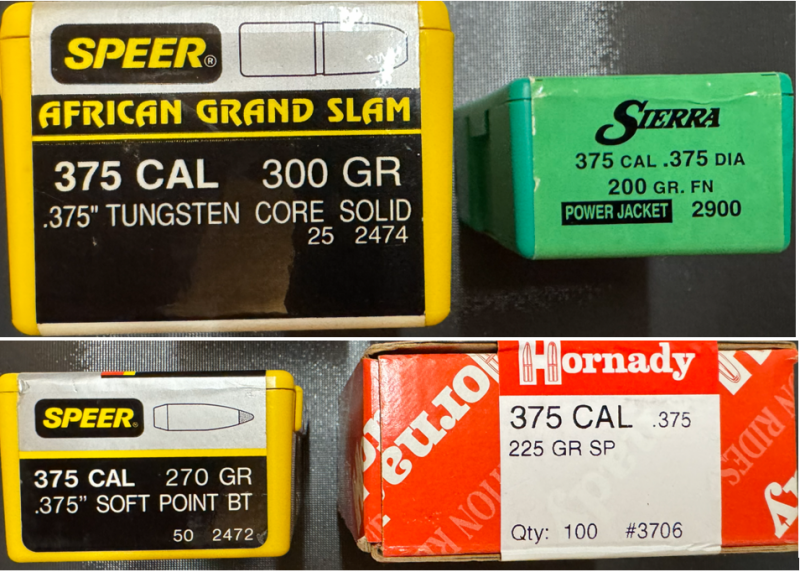 zum Verkauf stehen aus Wiederlader-Nachlass 225 Geschosse .375. 100 x Hornady 225 grain 50 x Speer Soft Point BT 270 grain 50 x Sierra 200 grain 25 x Speer African Grand Slam Tungsten Core Solid 300 grain