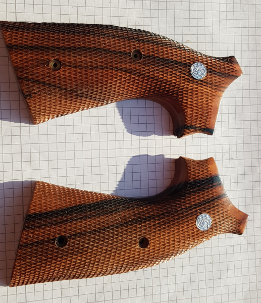 Sie bieten hier auf ein paar (li. + re.) Griffschalen passend für S&W 686 und baugleiche revolver, sog. "Big Butt" ausführung. Round Butt und offene rücken. Gebraucht aber kaum zu sehen. Optimal für beidhändiges bedienen die Waffe. Edelholz und angenehmes Checkering. Farbe wie auf dem Bild zu sehen. Es handelt sich exakt um die Griffschalen die auf dem Bild zu sehen sind. Am Tageslicht photo- daswegen schatten zu sehen. Weitere Bilder, Fragen etc. gerne jederzeit per anfrage hier. Versand per DHL mit Send. Nr. oder auch nach Wunsch. EU Versand kann hoher sein. Quadratische Hintergrund = 5 mm Raster. Mfg.
