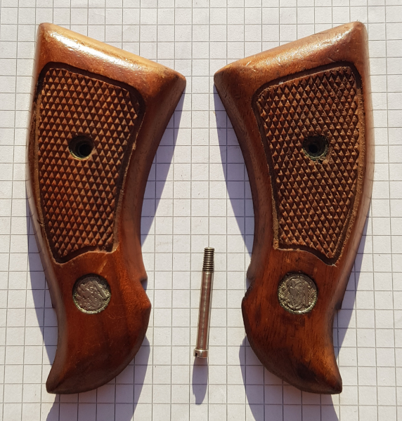 Ein paar griffschalen Original von S & W. Nussbaum. Mit gerahmten Fischhaut und Medaillon. "Square Butt" ( eckiger rahmen ) J Frame Komplett mit Schraube. Rechte Griffschalle innerseits mit aufschrift " K P C 586 ". Beide griffschalen innerseits aufschrift: " R?pal Bank". Sehr interessant auf jedem fall. Weitere Bilder, Fragen etc. gerne jederzeit. Versand per DHL mit Sendungs Nr. oder auch nach Wunsch. Quadratische hintergrund Raster = 5mm. Mfg.