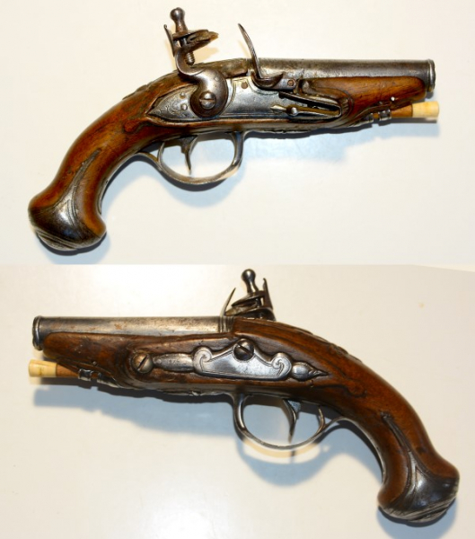 Steinschloss-Reisepistole um 1880, keine Herstellerangabe oder Stempelung, Lauflänge 8,6 cm, Gesamtlänge 18,7 cm, Kaliber 11,2mm, was ungewöhnlich für das Alter und den Verwendungszweck ist, der Lauf ist gezogen, Alterspuren ohne Mängel, technisch ok