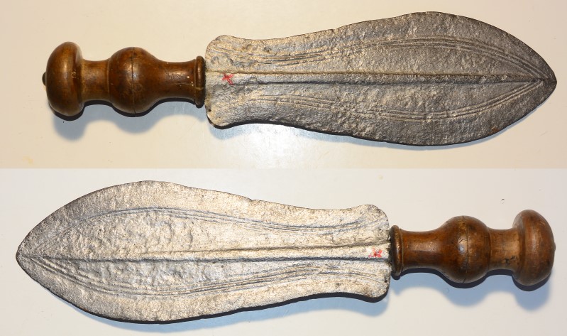 Afrikanischer Dolch mit breiter Zungenklinge, vermutlich aus dem Kongo, 23,5 cm lange Klinge mit der größten Breite von 9cm, die Klinge war wohl verrostet und wurde vom Vorbesitzer mit Silberbronze gestrichen, was sich aber mit Benzin oder Verdünnung wieder entfernen lässt.