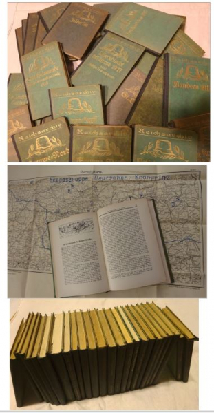 Sie bieten auf ein Konvolut von 24 Büchern, welche über einen Zeitraum von mehreren Jahren in den 1920er Jahren erschienen sind. In jedem Band wird eine Schlacht des ersten Weltkrieges erläutert, vereinzelt zieht sich eine solche Dokumentation über zwei Ausgaben. Teils ist großformatiges Kartenmaterial enthalten.