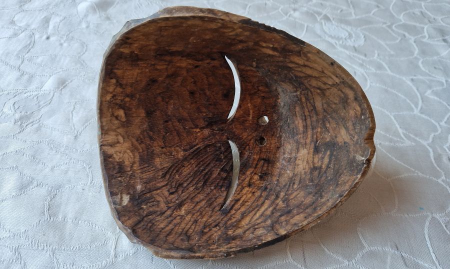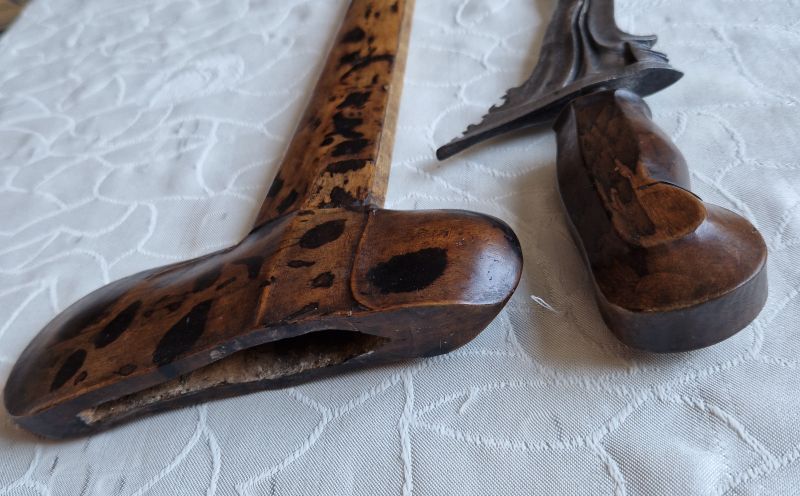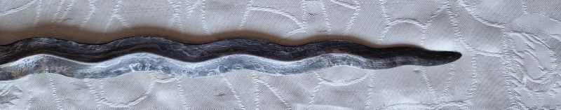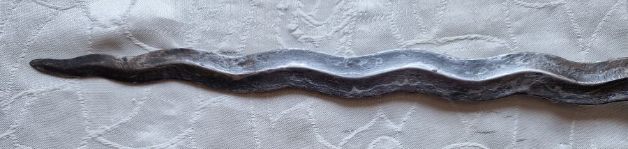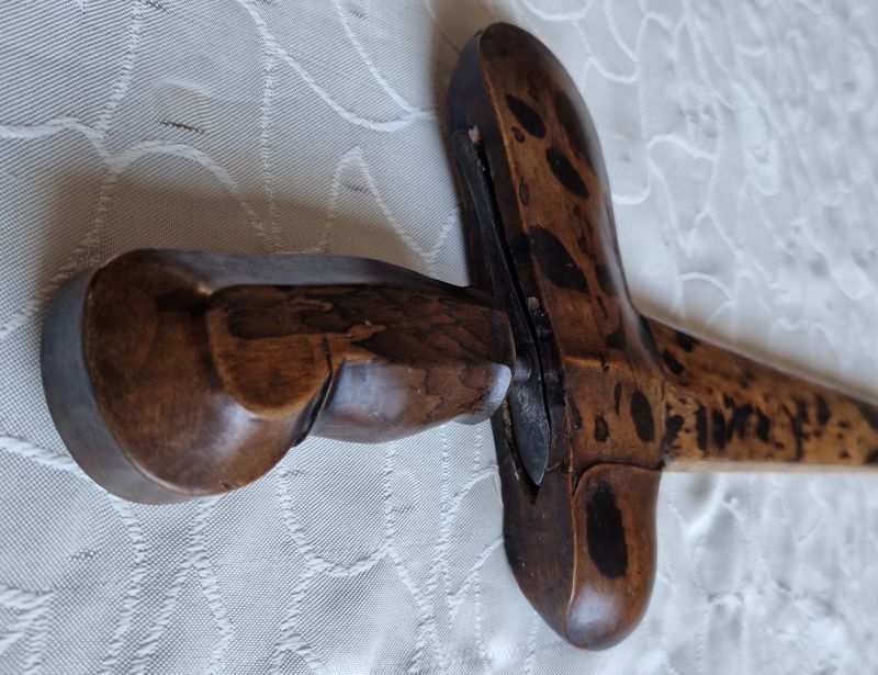 Feine, geflammte, geschnittene Rasenerzklinge. Abgesetzter Holzgriff. Holzscheide mit gebeizter Maßerung.