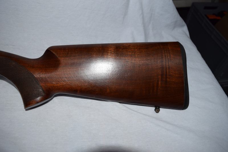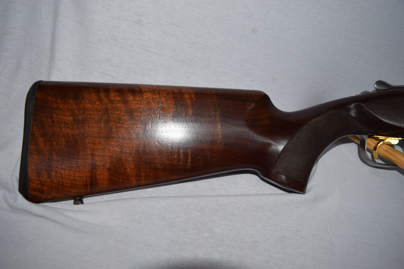 Nussholzschaft mit feinem Fischhautverschnitt am Griff & Vorderschaft, Abzugsbügel mit goldtauschiertem Browning-Logo, Tropfnase (tulpenförmig).