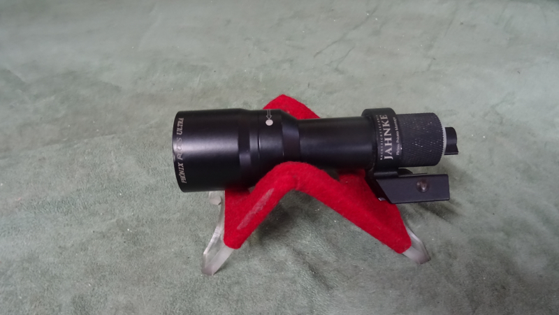 Gebrauchter IR Aufheller von Jahnke. Phönix Focus Ultra mit schwenkbaren Halter mit 25mm Durchmesser für 11 mm Prismenschiene. Linse ist ohne Kratzer.