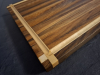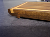 Biete zum Verkauf ein Schneidbrett/Serviertafel als Unikat/Einzelanfertigung an, das gute Stück wurde aus Weinfasseiche Lammelenweise wasserfest verleimt, rundum wurden Ahornleisten mit eingefrästen Saftrillen als Konterung gegen Verziehen des Materials eingelassen.