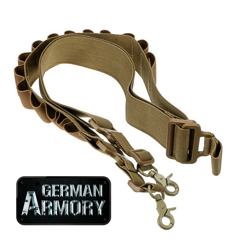 Wetterbeständiger beschichteter Stahl und Cordura. 2 stabile Karabiner, Platz für 13 Schuss Schrot. Farbe schwarz,khaki,grün nach Kauf bitte angeben.
