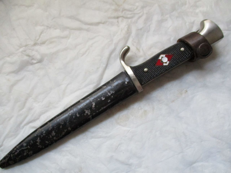 Hitlerjugend-Messer, gebrauchter Zustand mit aussergewöhnlicher Scheide. Anders als bei "normalen" HJ-Messern.