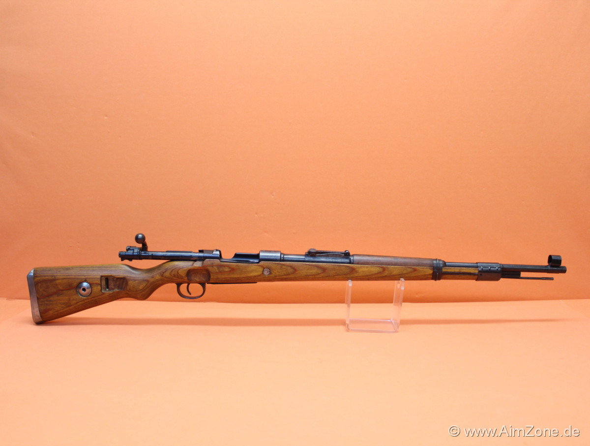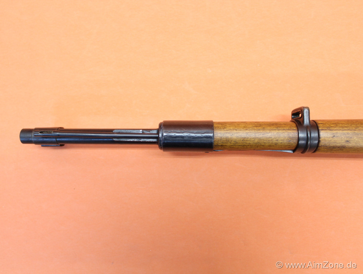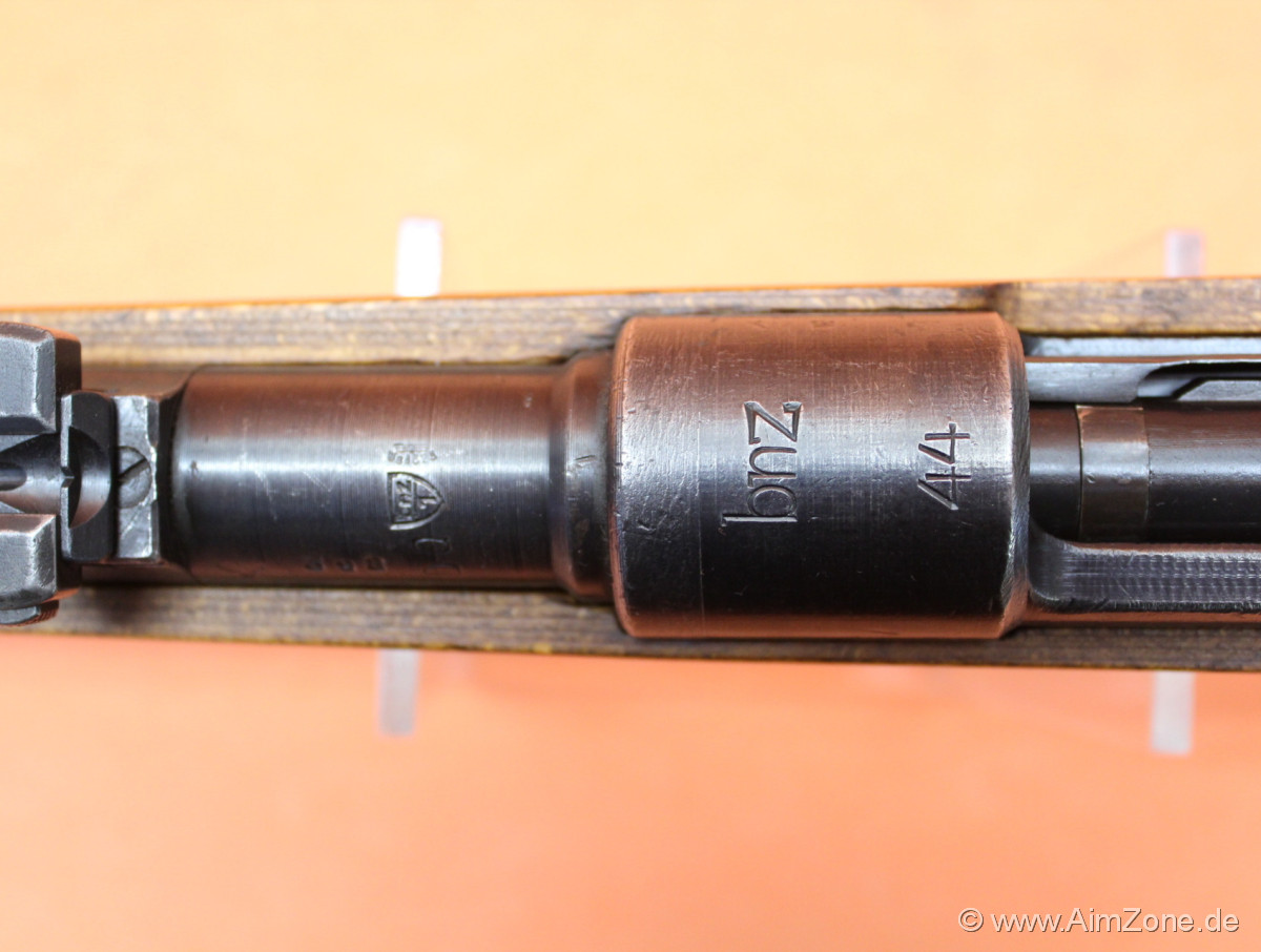 60cm Lauf mit Dachkorn (incl. Kornschutz)/ Schiebevisier bis 2000m. Hülse gestempelt: "bnz" (Steyr) und "44", seitlich "Mod.98", Abnahme "WaA823", Buchenholz Handschutz und Schichtholz-Schaft mit Bajonetthalter/ Riemendurchbruch/ Stempelplatte und Kolbenkappe, geprägter Oberring/ Unterring mit Riemenöse (seitlich), geprägter 5-Schuß Magazinkasten mit geprägtem Deckel. Incl. Putzstock. Gebraucht-/ Sammlerwaffe (ohne Zusicherung von mangelfreier Funktion/ Präzision). *Differenzbesteuerter Artikel nach §25a UStG*