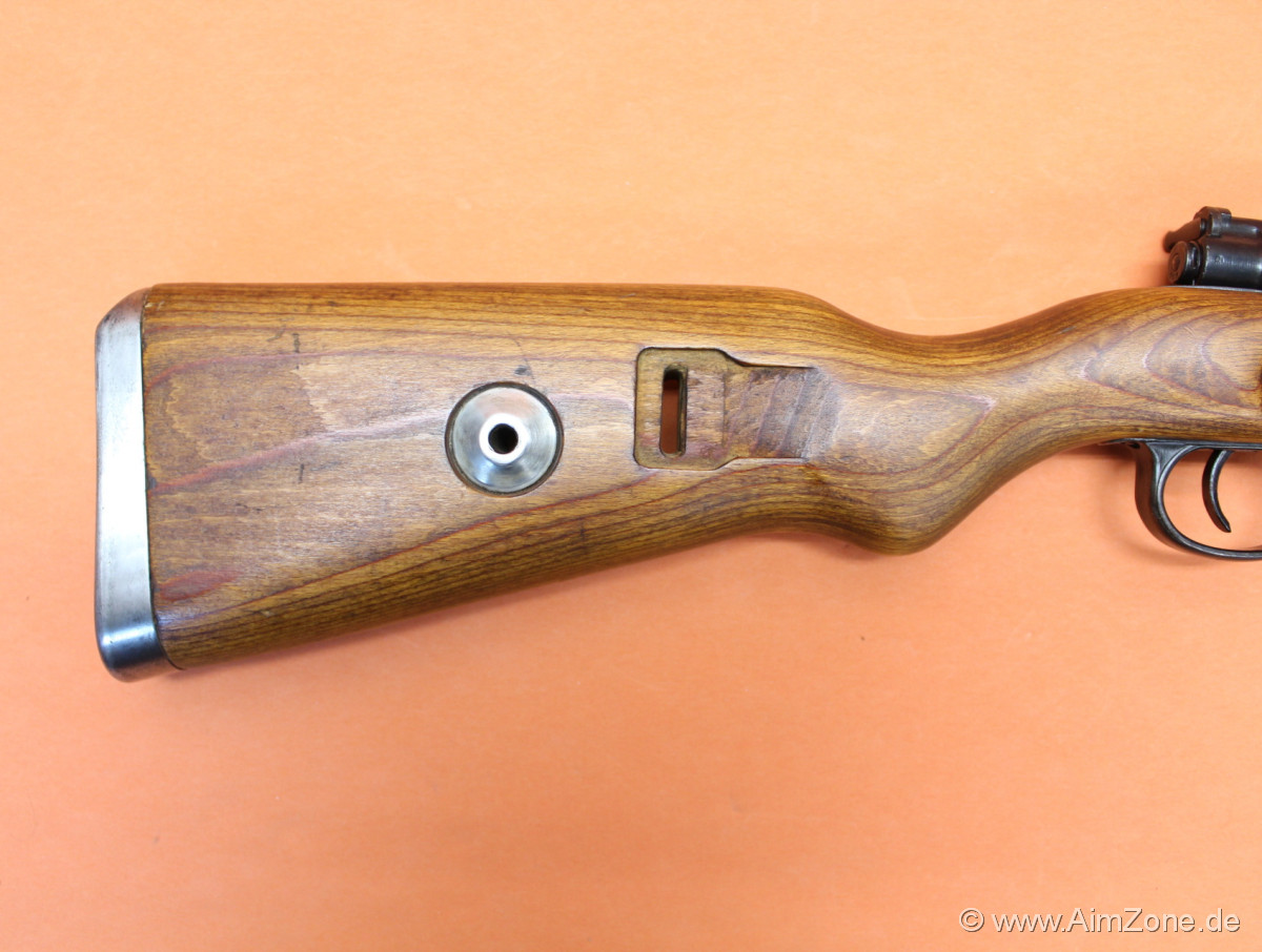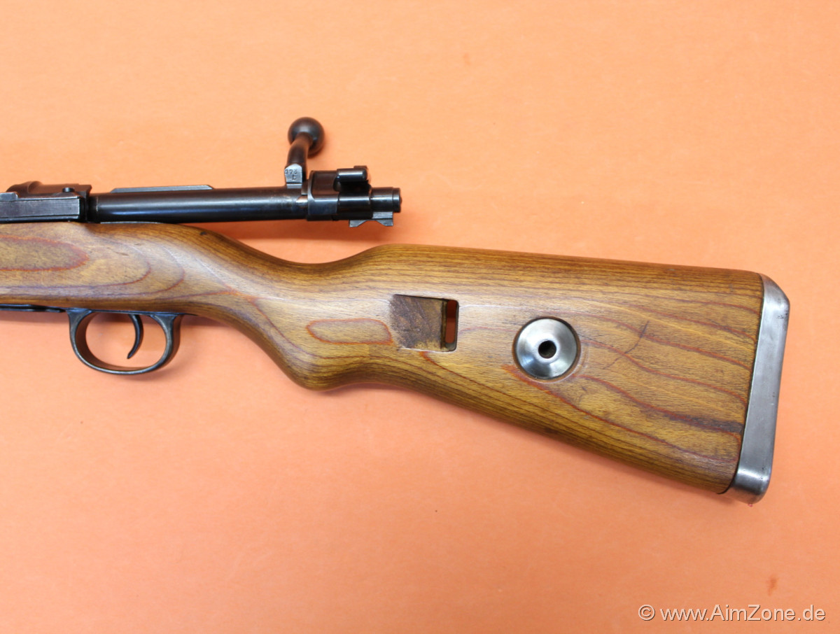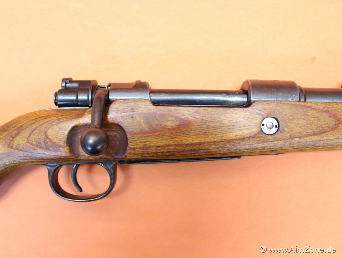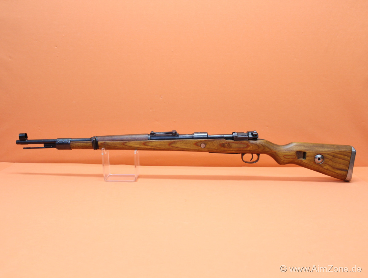 60cm Lauf mit Dachkorn (incl. Kornschutz)/ Schiebevisier bis 2000m. Hülse gestempelt: "bnz" (Steyr) und "44", seitlich "Mod.98", Abnahme "WaA823", Buchenholz Handschutz und Schichtholz-Schaft mit Bajonetthalter/ Riemendurchbruch/ Stempelplatte und Kolbenkappe, geprägter Oberring/ Unterring mit Riemenöse (seitlich), geprägter 5-Schuß Magazinkasten mit geprägtem Deckel. Incl. Putzstock. Gebraucht-/ Sammlerwaffe (ohne Zusicherung von mangelfreier Funktion/ Präzision). *Differenzbesteuerter Artikel nach §25a UStG*