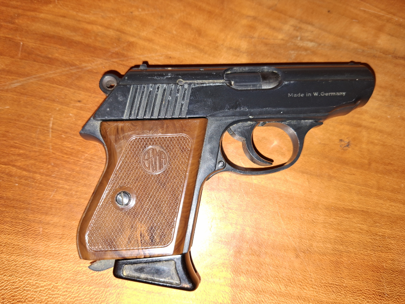 Biete hier eine Schreckschusspistole ERMA EGP 55 an. Die Pistole ist mit einem PTB Zeichen mit Nummer 208 versehen. Weiterhin ist bei den Beschusszeichen eine 79 zu erkennen, dürfte eventuell das Baujahr sein. Pistole ist mit der Nummer 004260 versehen.