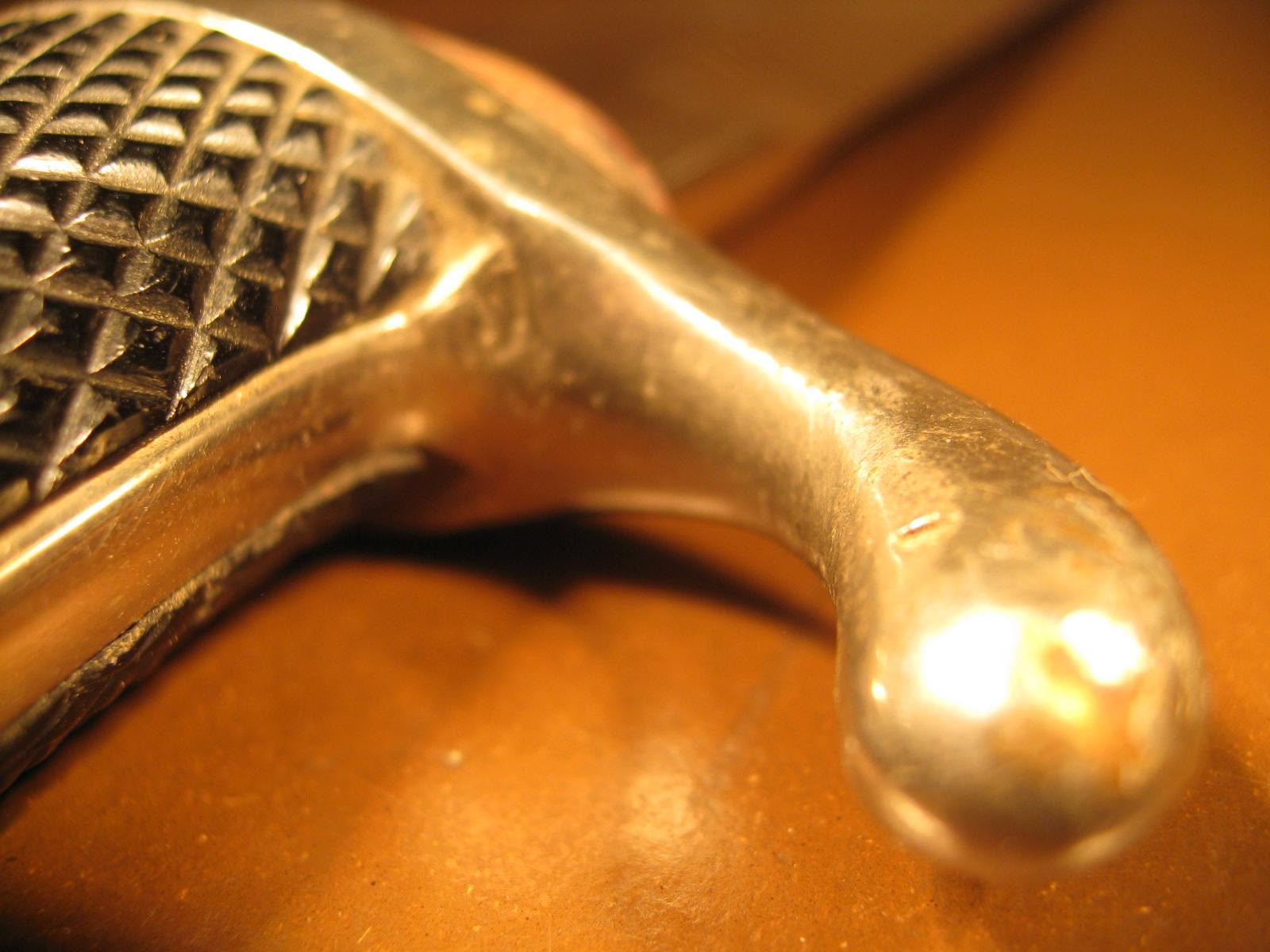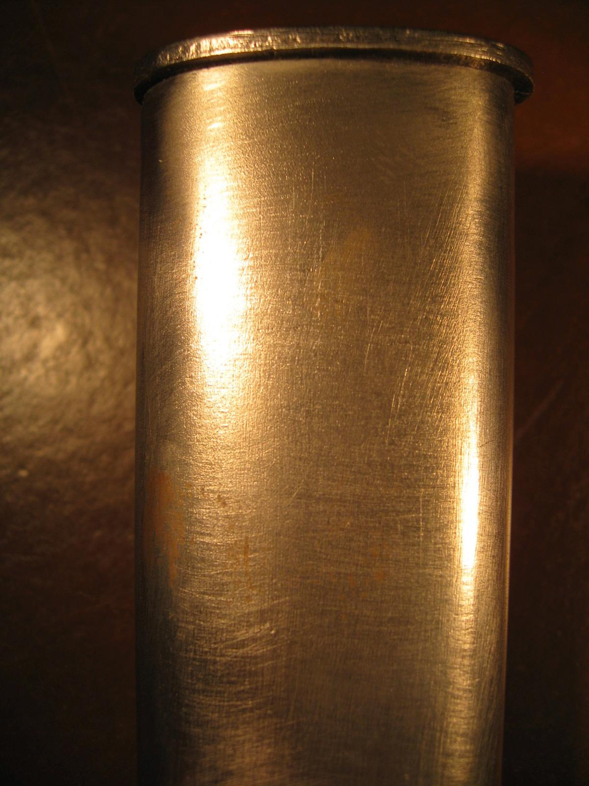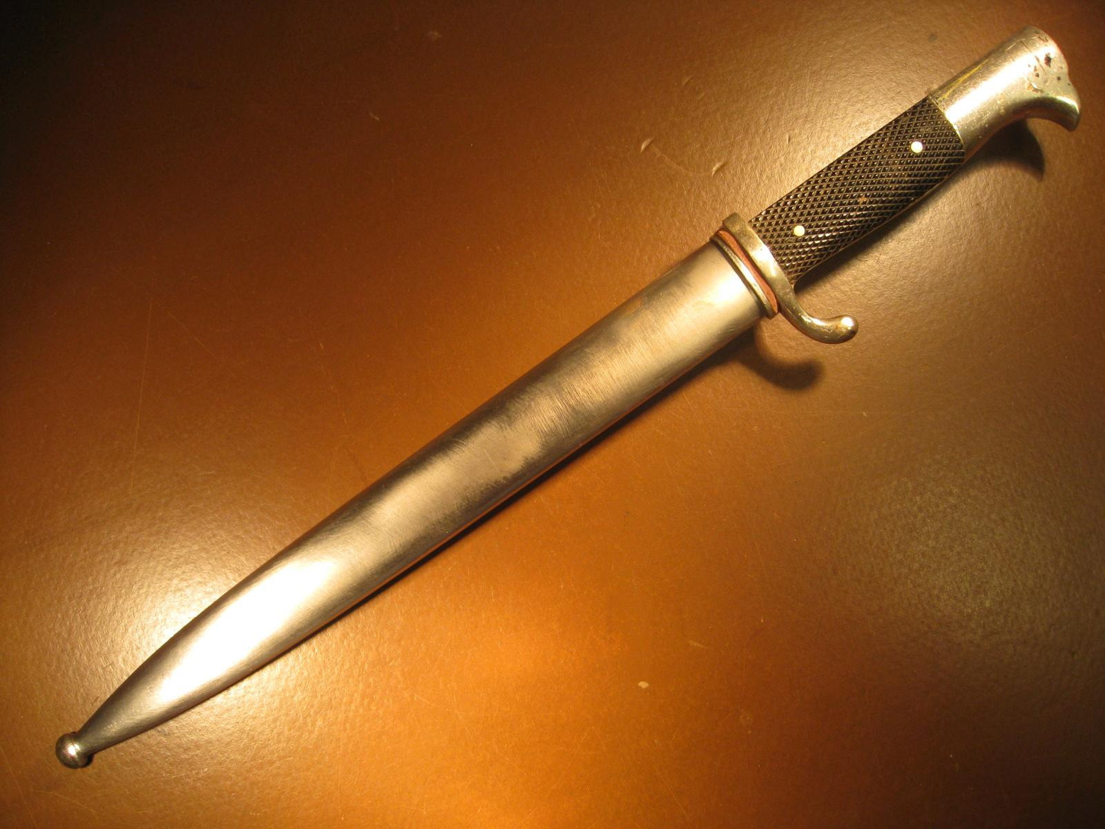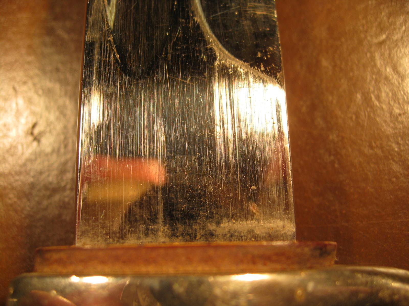 Die Scheide ist blank. Ich hatte bisher mehrere solche Scheiden. Ob sie so getragen wurden oder vom Besitzer/Träger so poliert wurden kann ich nicht sagen.