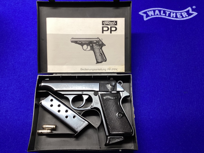 Verkaufe gebrauchte ehemalige Dienstwaffe der Polizei Niedersachsen, Fabrikat WALTHER, Mod. PP, Kal. 7,65 mm Browning, in Original Kunststoffbox mit Reservemagazin, Bedienungsanleitung sowie zwei Exerzierpatronen. Die halbautomatische Selbstladepistole ist nummerngleich (incl. Box) und zeigt bundesdeutsche Beschusszeichen des Beschussamtes Ulm aus dem Jahre 1976. Die Waffe ist funktionstüchtig. Sie weist alters- und gebrauchsbedingte Spuren beidseitig am Verschluss sowie stellenweise geringe Abnutzung der Brünierung insbesondere vorne am Verschluss auf. Das Zug-/Feldinnenprofil ist deutlich erkennbar und spiegelblank. Zustand siehe Fotos. Verkauf von privat nur an Erwerbsberechtigte. Keine Garantie/Gewährleistung und Rücknahme! Verkauf außerhalb Deutschlands innerhalb der EU nur über deutschen Händler möglich.