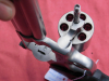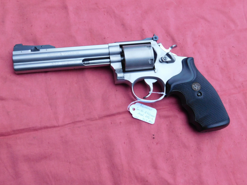 S&W Modell 686-4 Practical Champion Kal. 357 Magnum, 6 Zoll Lauf, Lauf innen spiegelblank und Profil scharf. Ungefutete Trommel, Timing und Abzug perfekt. Höhenverstellbares Korn. Großer Trommelschieber. Gültiger Beschuss vorhanden. Es ist keine Magnumrille vorhanden. Waffe hat meiner Meinung nach minimale Gebrauchsspuren, Pachmayr Gummigriff.