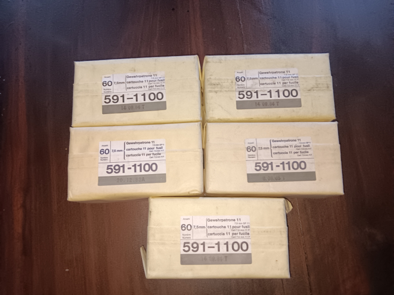 5 originale ungeöffnete Verpackungen, mit jeweils 6 Päckchen a= 10 Schuss, insgesamt 300 Schuss der Schweizer Gewehrpatrone GP11 abzugeben. Die Verpackungen sind noch verschlossen und in einem sehr guten Zustand.