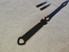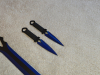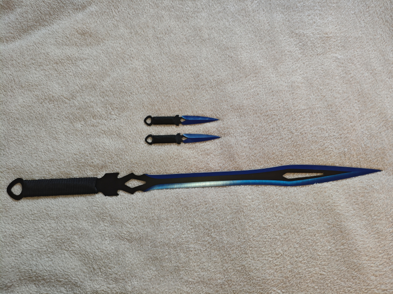 Sowohl die blau/schwarz beschichtete Schwert-Klinge als auch die beiden Wurfmesser sind aus 420er rostfreiem Stahl gefertigt und am Griffstück mit einer schwarzen Kordel umwickelt.