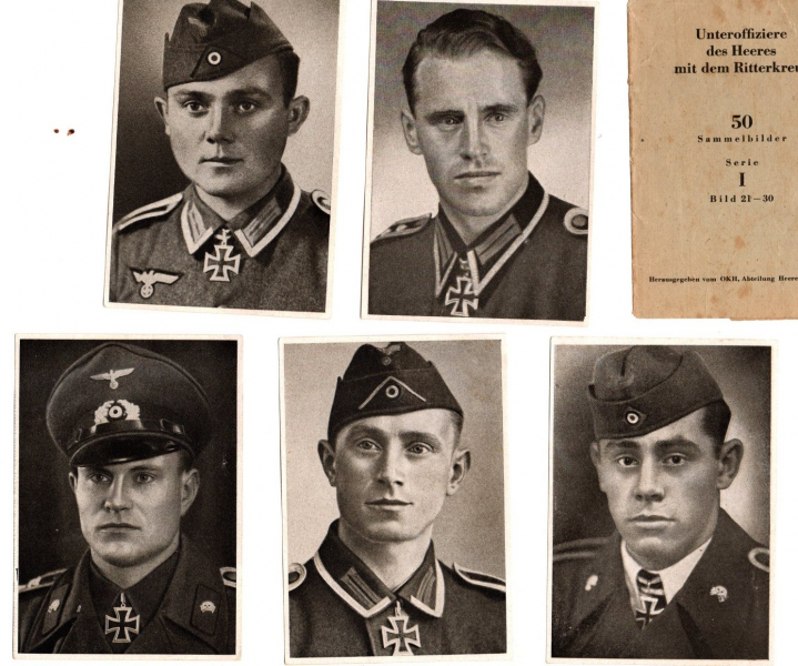 Fünf Sammelbilder mit Umschlag Ritterkreuzträger des Heeres Unteroffiziere Ebner, Fritsch, Amling, Schröpfer, Naumann, gebrauchter Zustand, original, keine Nachdrucke. Versand 4,50€
