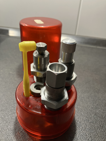 Aus Nachlass abzugeben ein Lee 38 Special / 357 Magnum Matrizensatz wie auf dem Bild zu sehen mit Hülsenhalter.