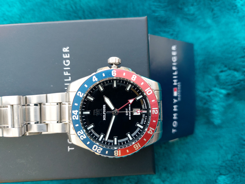 Neue Herrenuhr Modell GMT PEPSI, Swiss Made, Durchmesser 44 mm, Edelstahl 316 L, 20 bar/200 m Wasserdicht, verschraubte Krone, 2. Uhrzeit(GMT), Leuchtzeiger und Leuchtindexe, Neu, Fullset mit Herstellergarantie bis 23.05.2027, Armband-Ersatzglied dabei, Ladenpreis 250,- EUR. Eine unverwüstliche Uhr für Jäger, Abenteurer und Weltreisende. ---- Privatverkauf, ohne persönliche Garantie, aber volle Herstellergarantie.