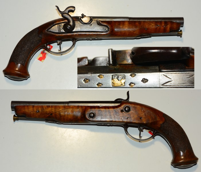 Französische Perkussions- Offizierspistole, aptiert von Steinschloss, sehr schöner Nussholzchaft, auf dem Lauf 2x 3 Gold ausgelegte Lilien, dieses Symbol war französisches Staatswappen zwischen 1814 und 1830 (nachnapoleonische Zeit), Lauflänge 18,7 cm, Gesamtlänge 3 cm, Kaliber 12mm, sehr schöner Zustand mit leichter Alterspatina, funktionsfähig, keine Markierung