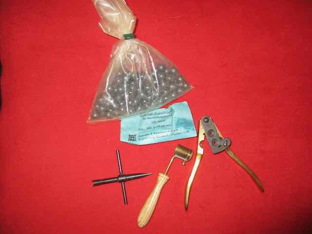 Ca 100 Rundkugeln H&N Kaliber .445 / 11,30mm, Piston-Schlüssel, Kugelzange wohl Kaliber .44 (unverbindliche Angabe), Meßbecher und Verkaufskarton mit