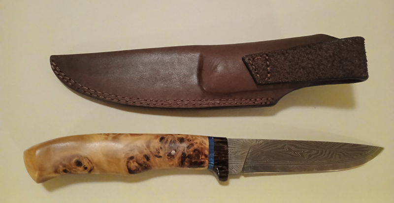 Der Griff wurde aus Wenge, blauem G10 und stabilisierter Maserpappel gefertigt und mit einem Mosaikpin in der Angel fixiert.