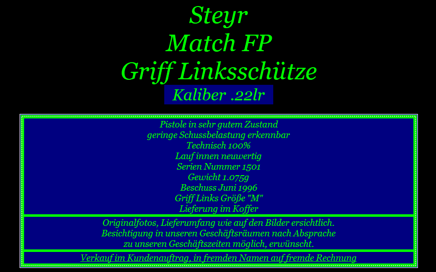 Artikel-ID: 20252666 ArtikelNr. des Verkäufers: 12487 Kategorie: KK-Sportwaffen > Freie Pistolen KK