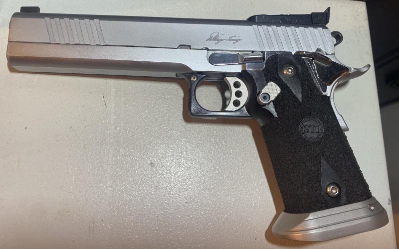 Rettinger 2011, Kaliber .45ACP, Lauflänge 6“, Aristocrat 3-Stellungsvisier, 1A Zustand, hat bisher nur 500 Schuß gesehen, 4 Magazine, Magazinkapazität 13 Schuß.