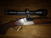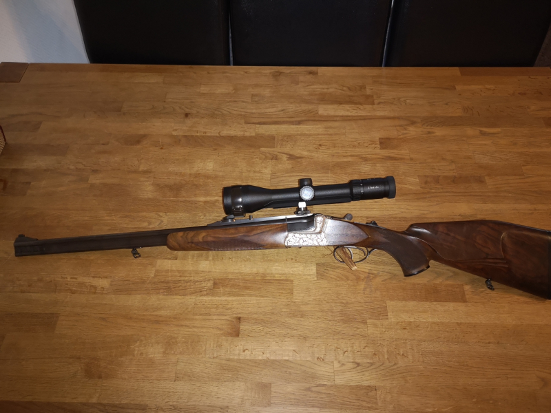 Die Waffe verfügt über eine Handspannung, welche beide Schlosse spannt, ebenso über Rückstecher für beide Abzüge. Mittels Schwenkmontage ist ein Zeiss 2,5-10 x 50 montiert, mit Absehen 4 und Leuchtpunkt. Das Glas passt sehr harmonisch zu dem Gesamtbild dieser Waffe.