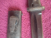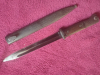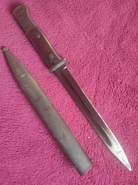 Bajonett mit Holzgriff und Stahlscheide. Verriegelung fest. Beschriftung S 155 G auf Messer und Scheide. 2376 auf der Scheide und 3053 auf dem Bajonett. Schleifspuren vom nachschleifen erkennbar.