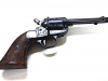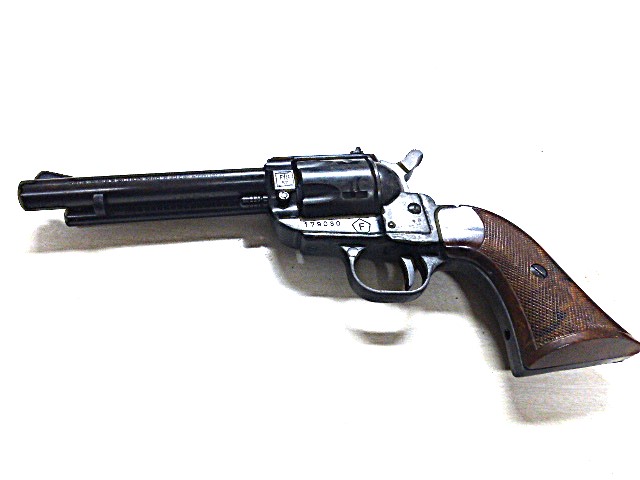 Trommel, Lauf und weitere Teile sind aus Stahl. In Höhe und Seite verstellbare Kimme. Single Action.