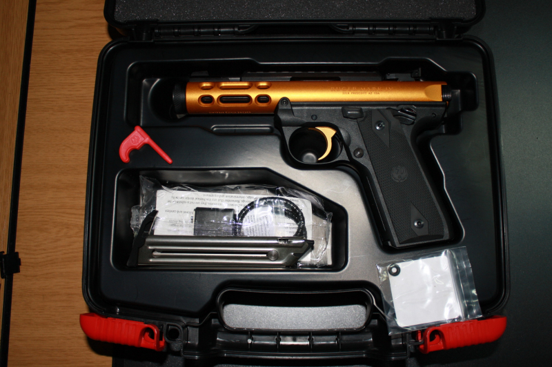 Waffen: Ruger MK IV Lite in .22lfb goldanodisiert (in real ein wenig heller als auf dem Foto), Referenzwaffe genau 20 Schuss alt.inkl. Zubehör