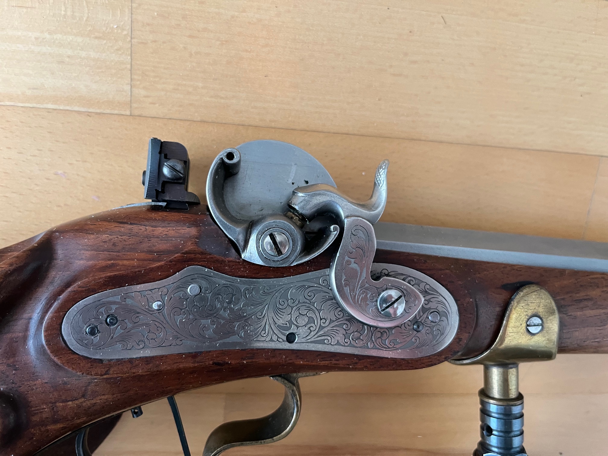Das Gewehr ist eine originalgetreue Neuauflage mit Nußbaum Backenschaft, blank poliertem Achtkantlauf in sehr gutem Zustand und 7 ca. 0,30 mm tiefen Zügen. Gravierte Schlossplatte und Hahn. Voll funktionsfähig.