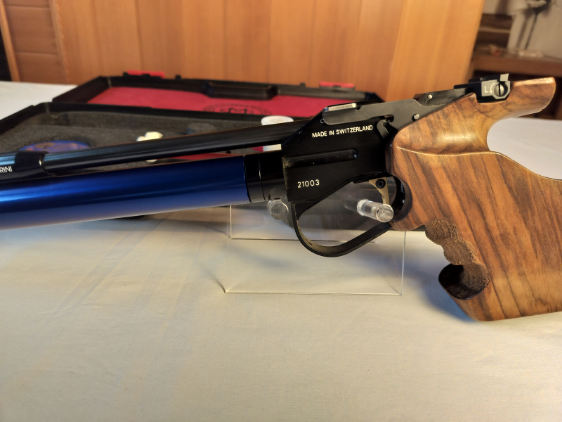 gebrauchte Morini Luftpistole mit elektr. Abzug 2 Kartuschen bis 2028, Formgriff rechts und Bedienungsanleitung, Fülladapter und Koffer (etwas ausgebessert)