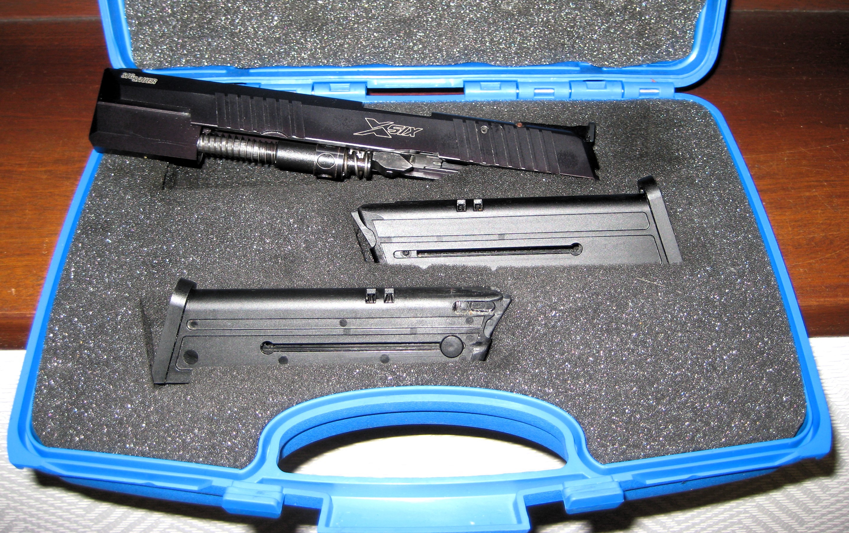 Verkauft wird die Waffe mit den abgebildeten zwei Magazinen und der Transportbox.