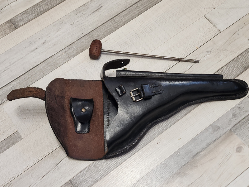 Gebe nun meine letzten schönen Stücke ab: Lange Pistolen Tasche für P08 denke ich, mit Stock, Gesamtlänge 30cm ca., beim kleinen inneren Täschen ist der Metallknopf ausgerissen.Sicherlich für einen Geübten wieder zu korrigieren.