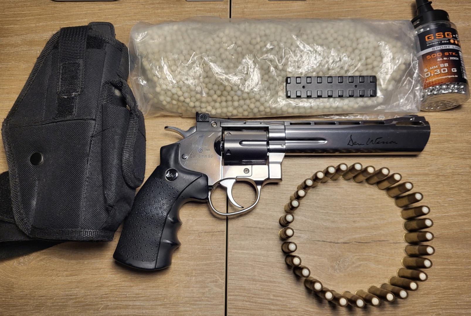 Dan Wesson 6" CO₂ Revolver 6mm BB Vollmetall silber + 31 Patronen + Holster + Picatinny + viele BBs ||| Ich verkaufe hier meinen Dan Wesson 6" CO₂ Revolver in silber (Vollmetall), Kaliber 6 mm BB. Sehr schweres, wertiges Modell – ideal für Plinking / Sammlung. ||| Zustand: Gebraucht, voll funktionsfähig, geringe Gebrauchsspuren vorhanden, u.a. zwei Abdrücke/Madenschrauben-Spuren von der Picatinny-Schiene (siehe Foto) - Dichtungen wurden erneuert - Patronen: 31 Patronen/Hülsen mit Lagerungsspuren, funktionieren aber einwandfrei (nur optisch mit Patina, siehe Foto), Patronen wurden zur Pflege mit Waffenöl behandelt ||| Lieferumfang (wie abgebildet): Dan Wesson 6" CO₂ Revolver, Vollmetall, silber - 31x Patronen/Hülsen - Holster/Halfter - Picatinny-Schiene - 6 mm BBs in hoher Stückzahl (Beutel + Flasche, siehe Bilder) ||| Altersnachweis: Verkauf ausschließlich an Personen ab 18 Jahren. Altersnachweis erforderlich (Ausweiskopie geschwärzt bis auf Name/Geburtsdatum genügt). ||| Versand: Versand nur innerhalb Deutschlands - Abholung möglich nach Absprache ||| Privatverkauf / Rechtliches Privatverkauf unter Ausschluss jeglicher Sachmängelhaftung / Gewährleistung. Keine Garantie, keine Rücknahme, kein Umtausch.