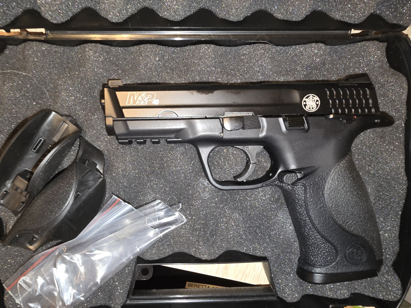 Hallo, biete hier eine Smith&Wesson MP 40, 6mmBB, CO2 an, in schwarz. Die waffe hat Blowback, hat keine gebrauchspuren, waffe ist aus Metall mit polymer body, sie ist dicht und hat ein F zeichen. Mit dabei ein Waffenkoffer, sechskantschlüssel und wechselgriffrücken. Was aussieht wie Flecken auf der waffe sind nur Öl Spuren von der Pflege. Waffe ist ungeschossen.