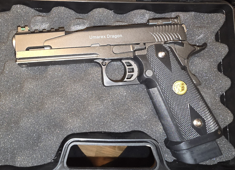 Hallo, biete hier eine WE Umarex dragon, 6mmBB, Gas an, in grau. Die waffe hat Blowback, hat gebrauchspuren, waffe ist aus Metall, sie ist dicht und hat ein F zeichen. Mit dabei ein Waffenkoffer. Was aussieht wie Flecken auf der waffe sind nur Öl Spuren von der Pflege.
