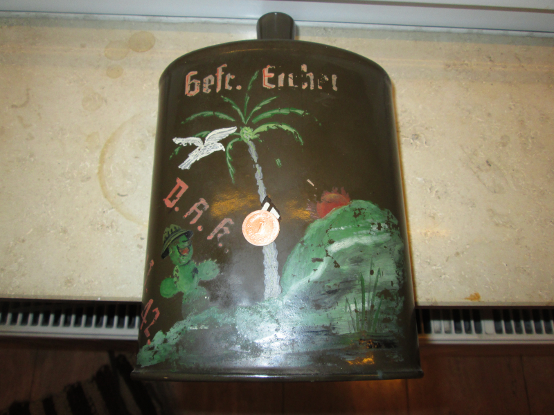 Verk. aus meiner Sammlung eine Englische Wasserflasche, Beute Afrika Corps, ein seltenes privates Relikt vom DAK, leider fehlt der Stöpsel Bilder sind Bestandteil der Auktion
