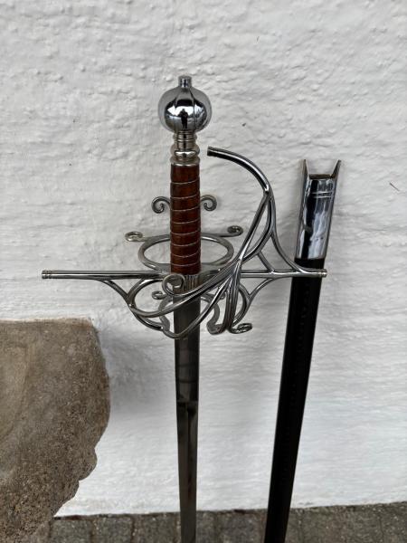 Elegantes und sehr aufwendig gefertigtes Rapier im Stil der frühen Neuzeit, angelehnt an spanisch-italienische Originale des späten 16. bis frühen 17. Jahrhunderts. Auffälliges Swept-Hilt-Gefäß mit zahlreichen Schutzbügeln, kombiniert mit einer langen, schlanken Klinge aus Federstahl.