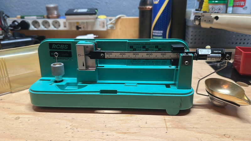 RCBS 10-10 Pulverwaage ist komplett mit 500 grain Zusatzgewicht. Die Schutzhaube hat einen Riss. Die Waage ist im gutem Zustand und sie ist eine sehr genaue Waage. Die Waage ist frisch Kalibriert und ist in Funktion einwandfrei.