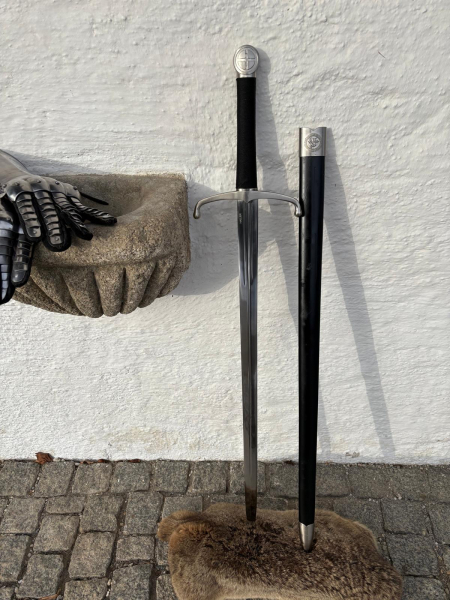 Die schwarze Scheide mit heraldischem Emblem unterstreicht den ritterlichen Charakter und hebt das Stück deutlich von einfachen Repliken ab.